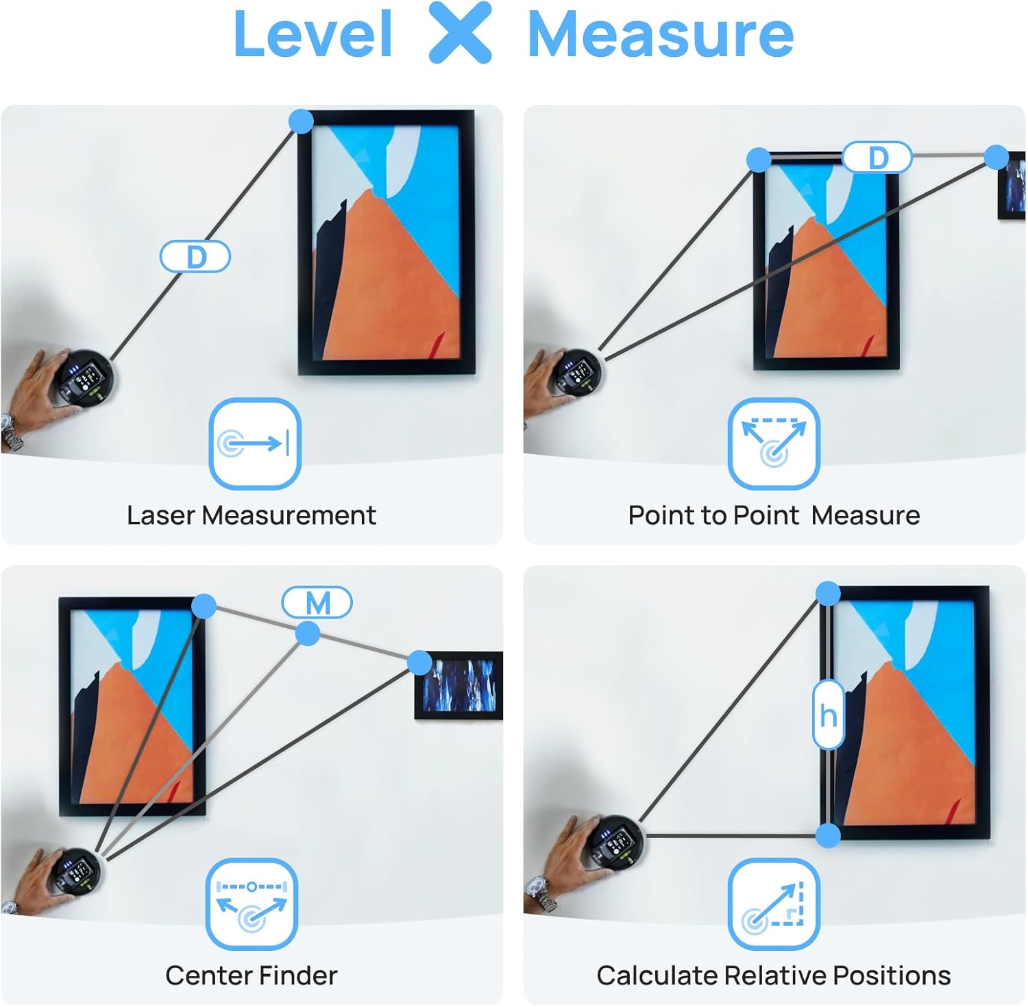 - 【P2P Laser Measure & Center Finder】-The M-Cube 02 Anti-Gravity features 360° Flexible Rotation with advanced Angle Detection and enables Point-to-Point Measurement and Center Finding, along with relative position calculation. For enhanced accuracy, pair it with CenterMate and TargetMate—the target board allows precise measurements anywhere, while CenterMate helps pinpoint key points easily