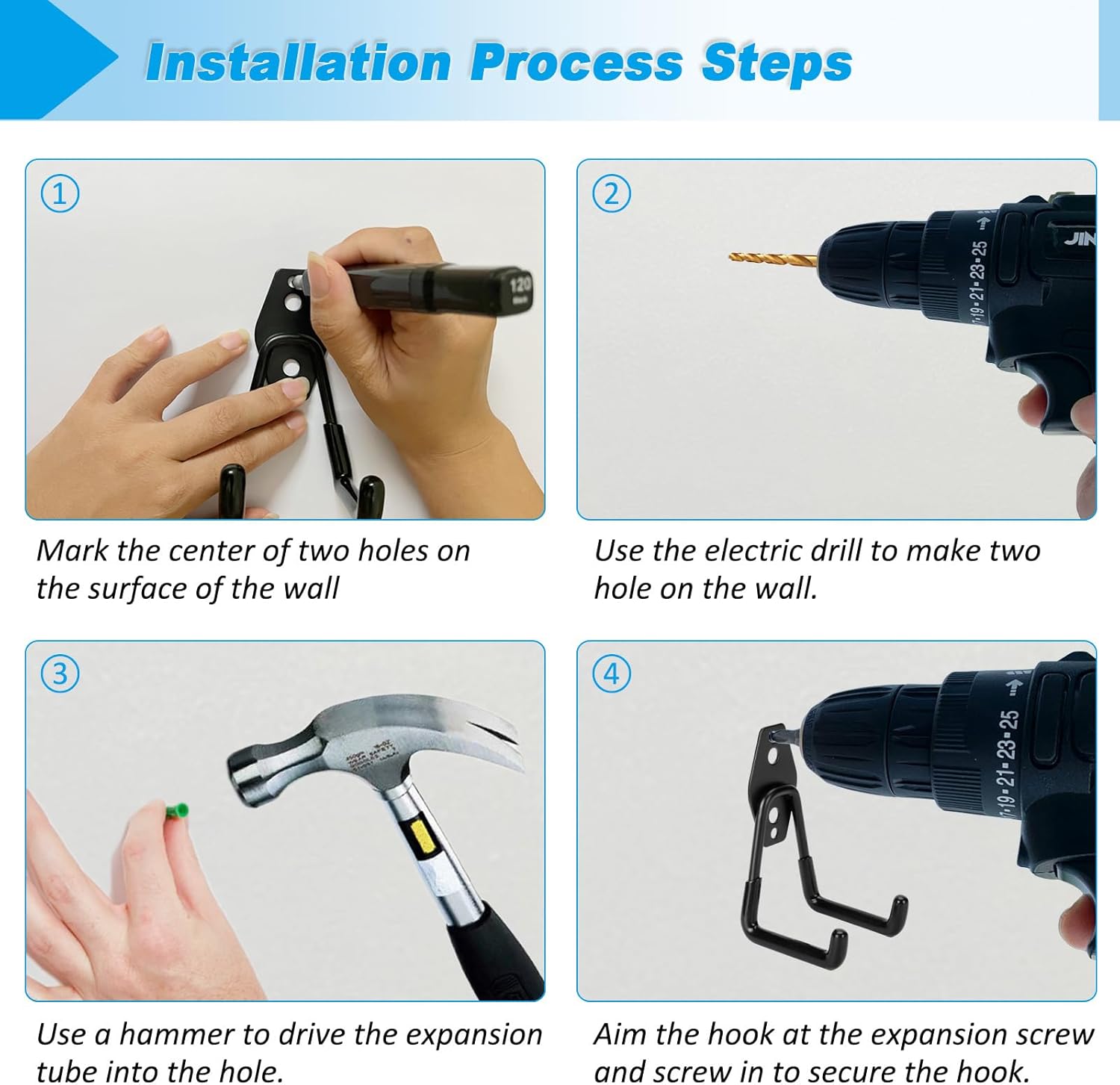 - Easy Installation: Place the garage storage hook on the wall where you want to install, mark the screw holes for the hook with a marker, select the correct anchor bolt and install it in the marked screw holes, then fix the hook to the wall. The entire installation process requires an electric drill, screwdriver and hammer.