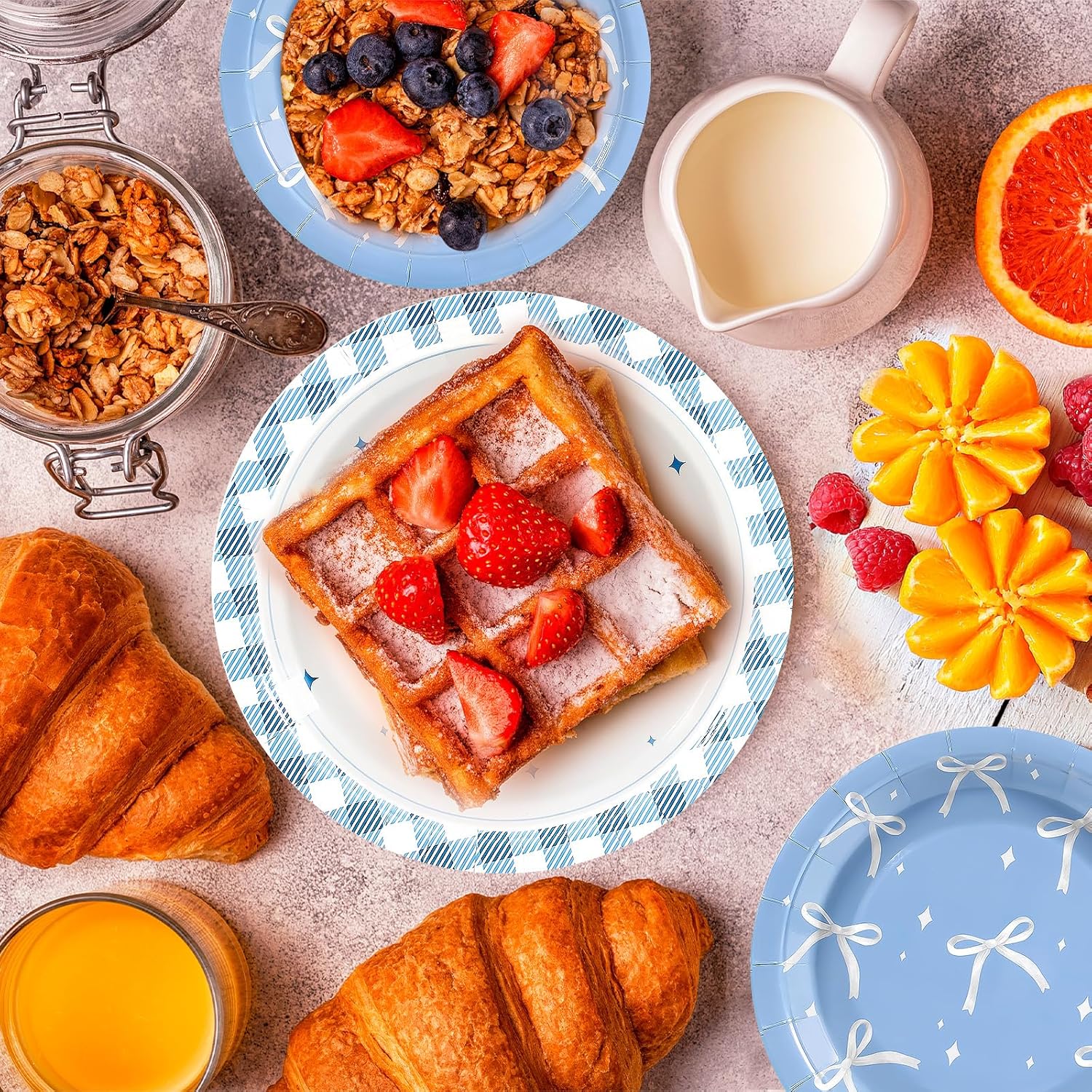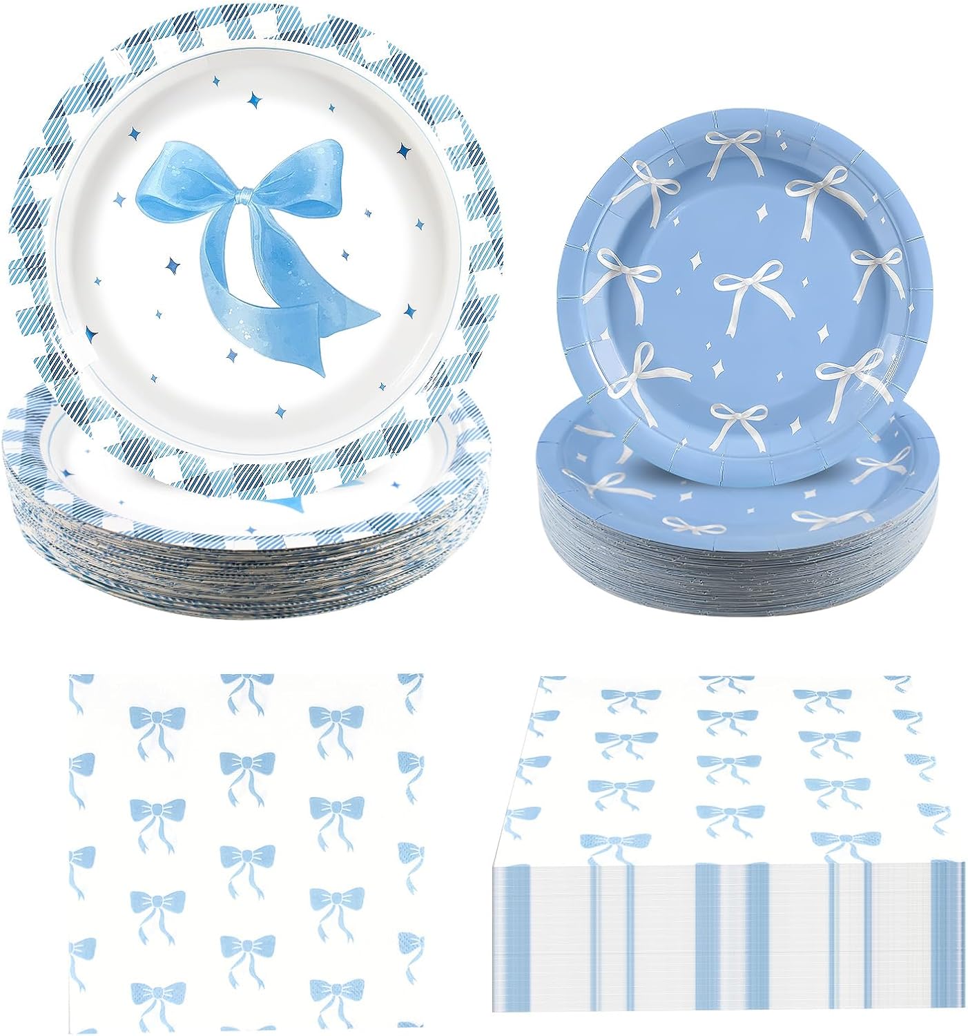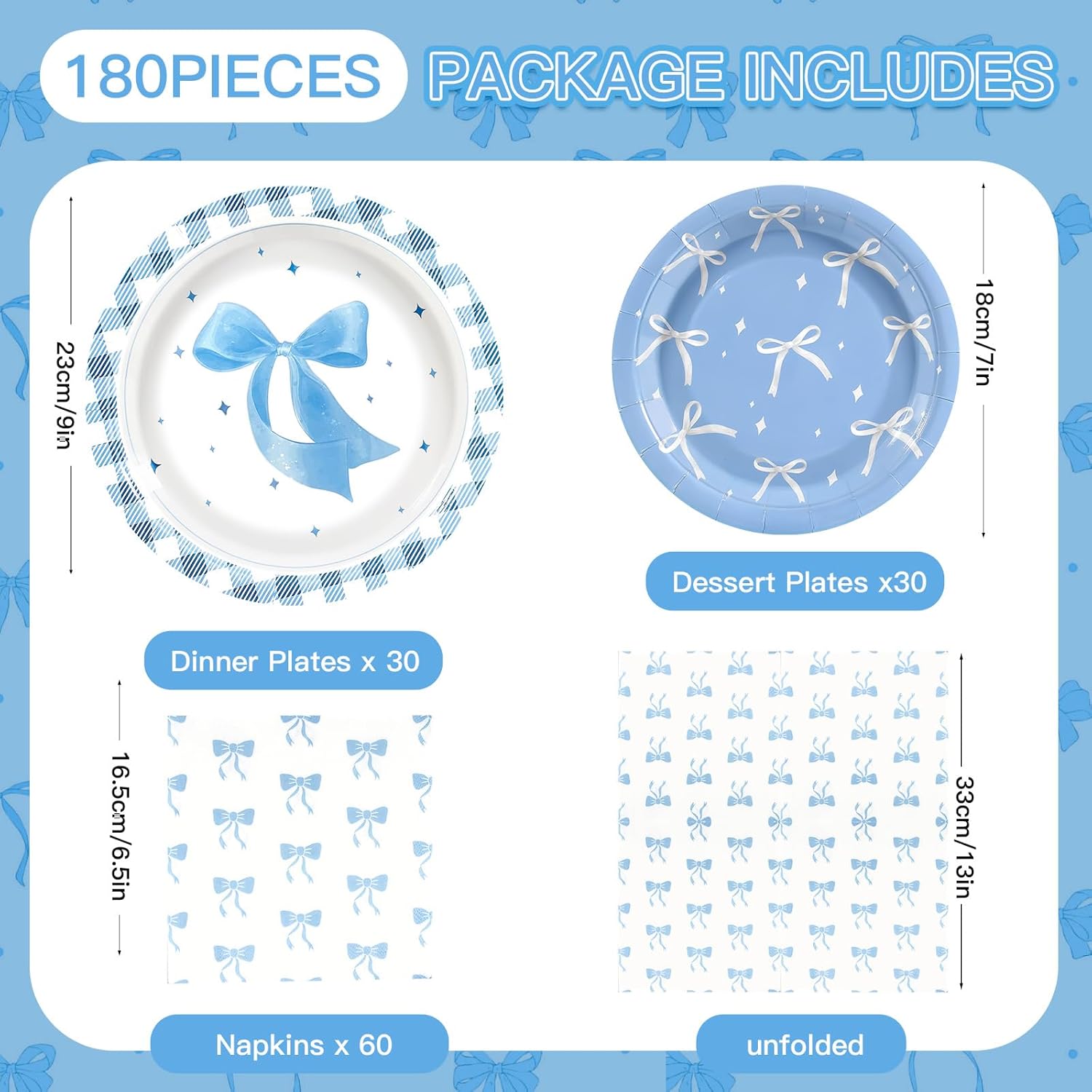 180Pcs Blue Bow Party Supplies Paper Plates and Napkins Serve 60 Disposable Tableware Set for Birthday Party Decorations Game Day Family School Holiday Sports Events
