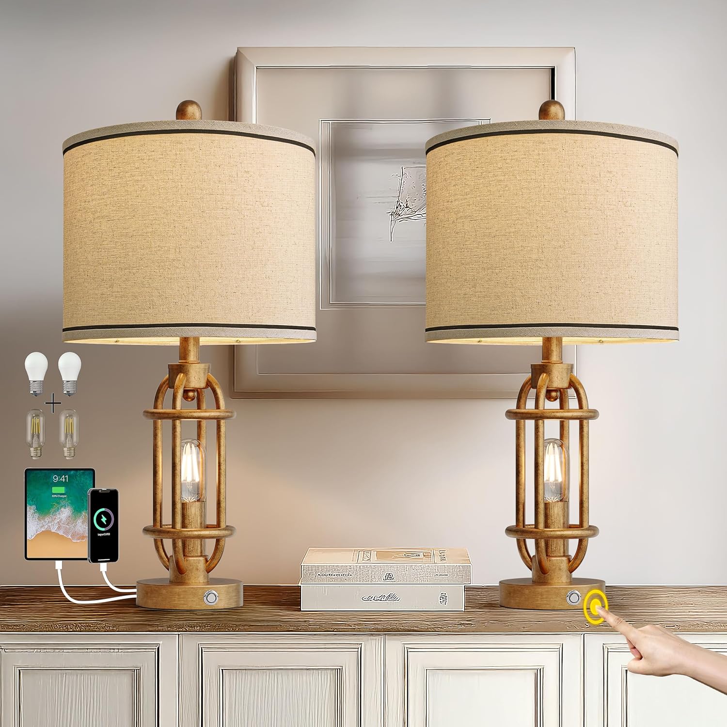 23.75'' Table Lamps Set of 2 for Living Room Bedroom Industrial Farmhouse Metal Touch Lamps with USB A+C Ports, Night Light Vintage Nightstand Bedside Lamp, Bulbs Included, Antique Gold
