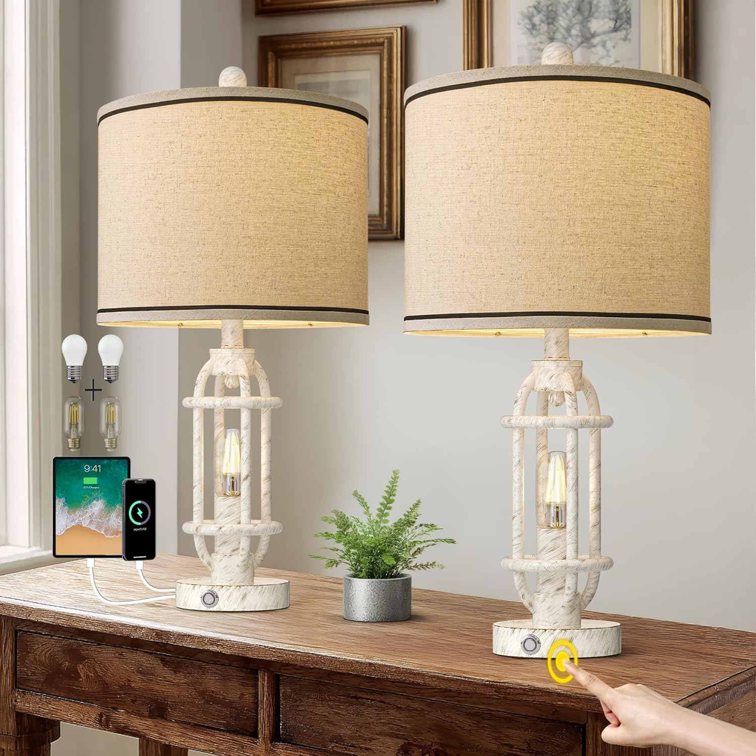 23.75'' Table Lamps Set of 2 for Living Room Bedroom Industrial Farmhouse Metal Touch Lamps with USB A+C Ports, Night Light Vintage Nightstand Bedside Lamp, Bulbs Included, White