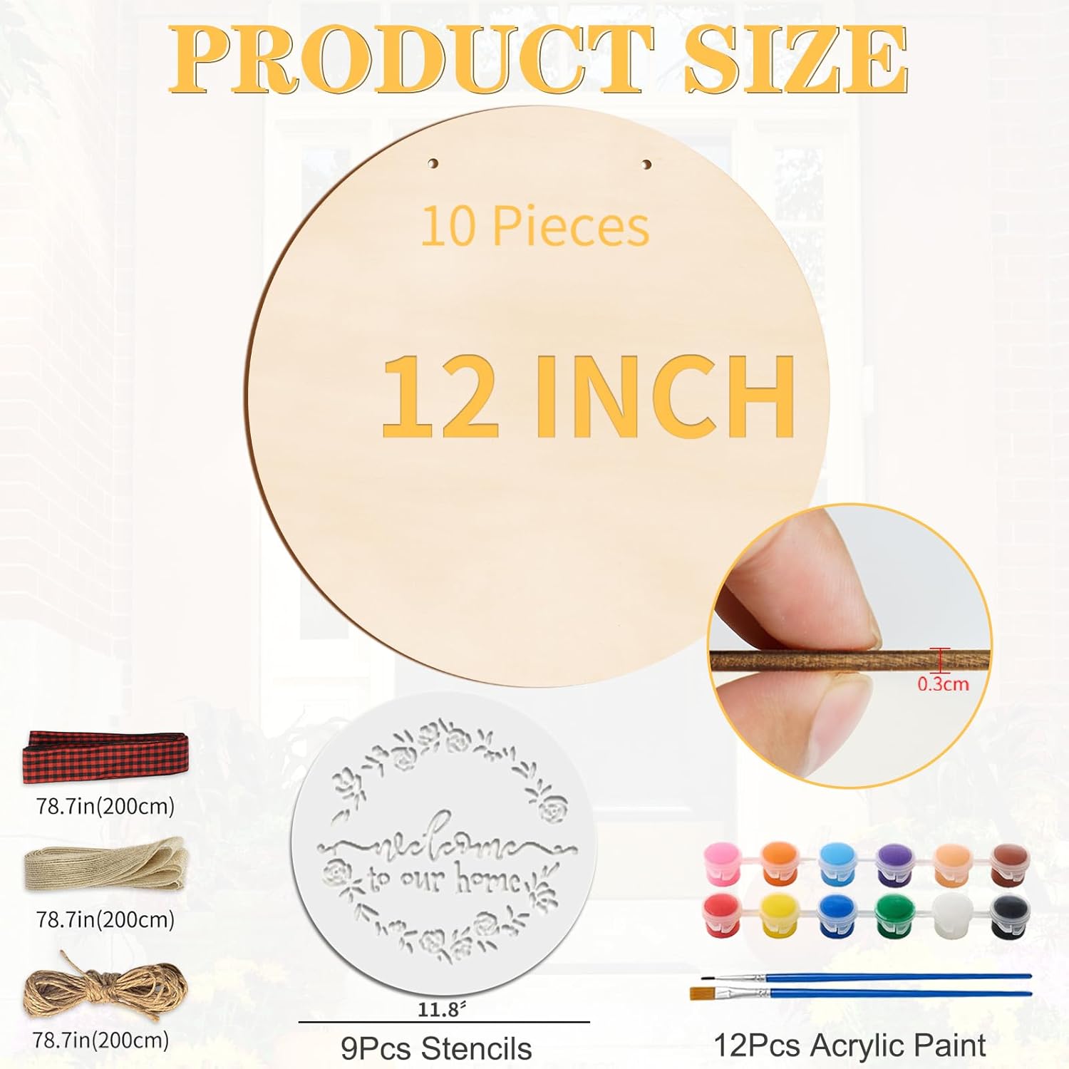 - 【Sufficient Quantity to Use】You will receive 10 pieces 12-inch unfinished wood rounds, 9 pieces painting stencils, 12 pieces acrylic painting, 3 bundles of ribbons, you will have enough signs to make multiple wooden signs or gift them to friends and family, do not need to worry about running out in a project or having to purchase additional stencils.