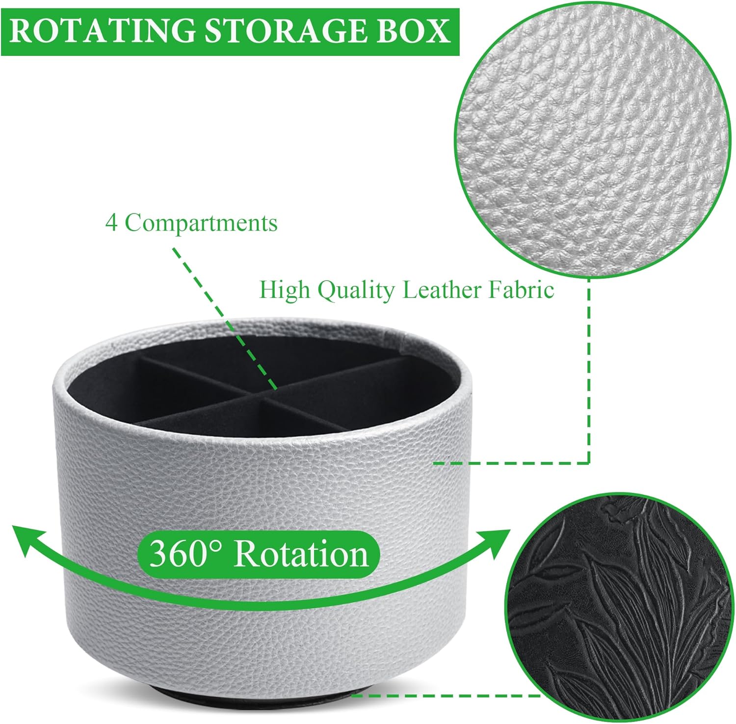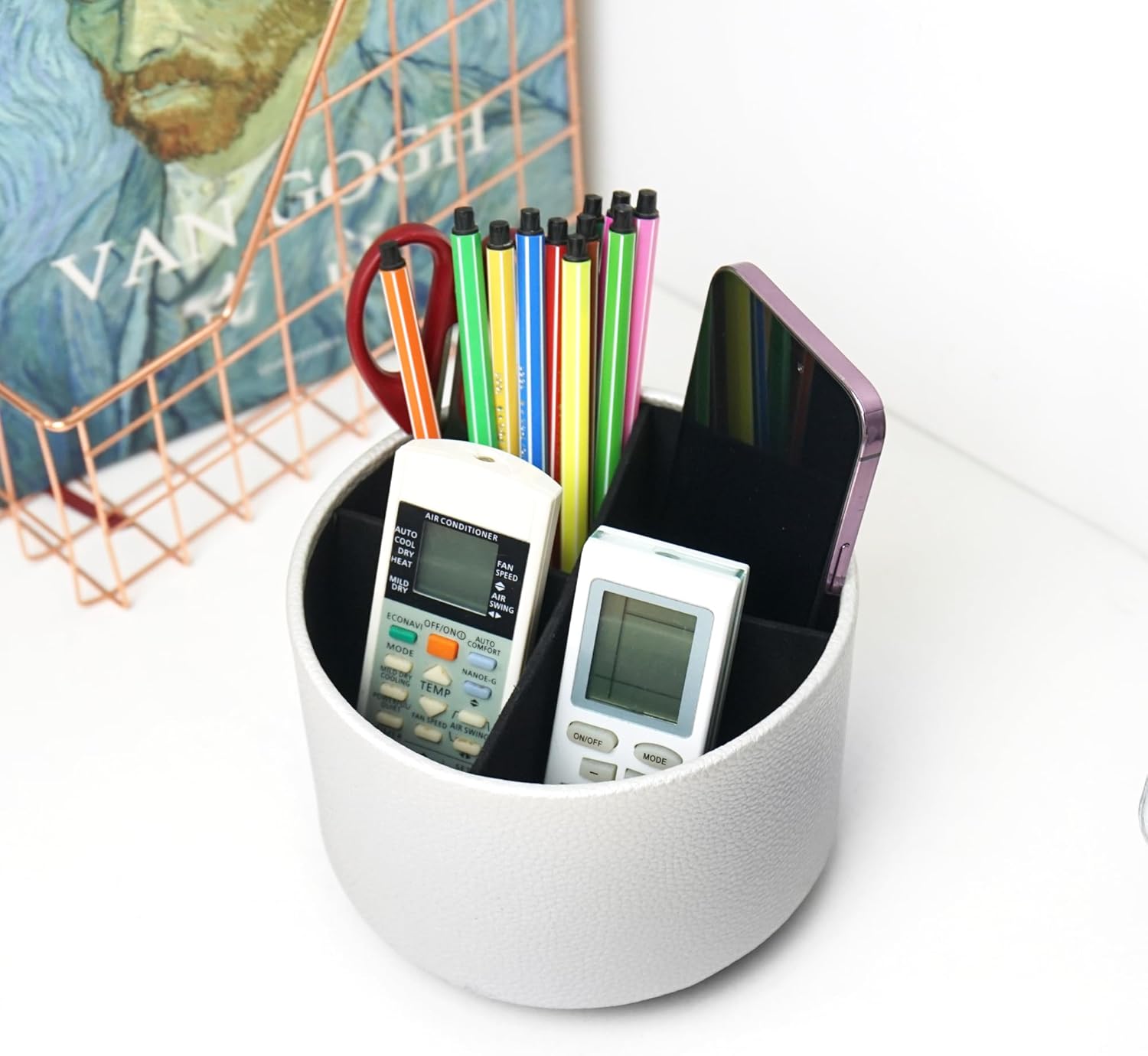 Hennaja Round Leather Art Supply Organizer,Remote Control Holder,360 Degree Spinning,Multi-Functional Pencil Holder,4 Compartments Desktop Stationary Organizer(1-Lichee Silver)
