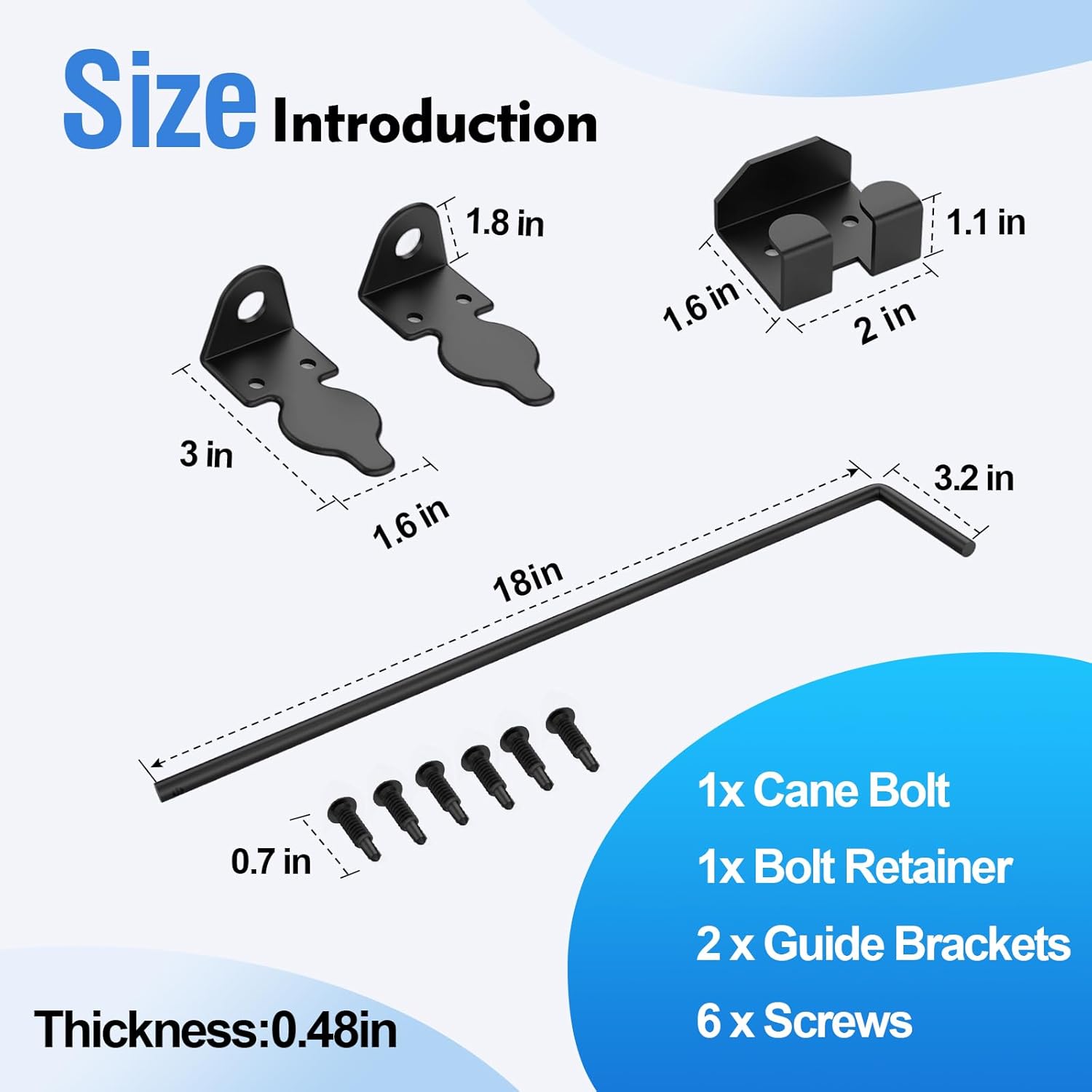 - Convenient Use: When fixed doors, Put the cane bolt on the bolt holder, Just turn the rod manually Lower the cane latch and insert it into the hole you have made, Securing the door in place, When not in use, Place bolt on the bolt retainer