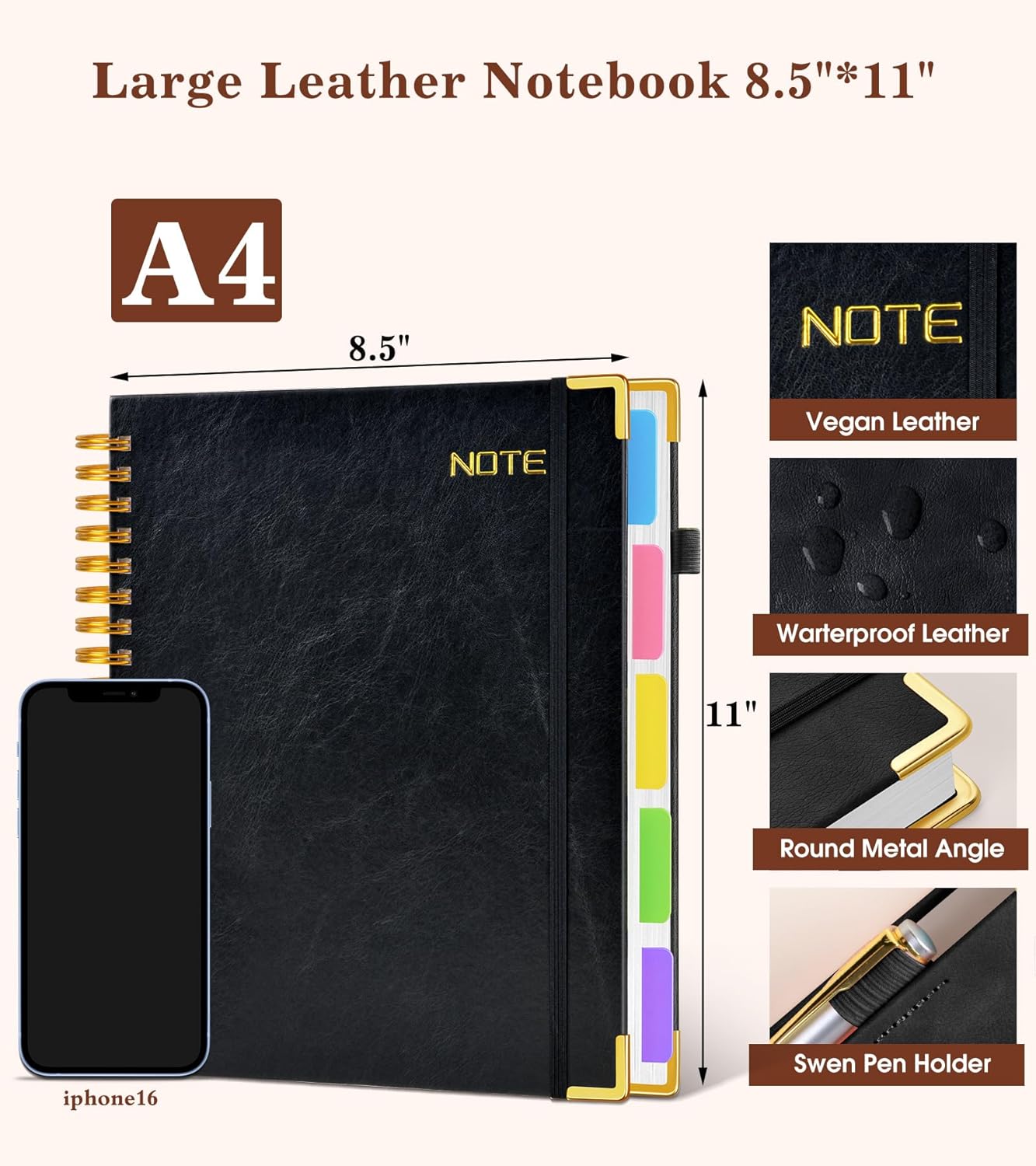 - 【Leather Hardcover Spiral Notebook】Textured leather with gold print appear an elegant look meanwhile waterproof feature wipes clean easily doesn’t absorb dirt. 4 gold metal corner and right side elastic closure band holds up college ruled notebook beautifully withstand frequently throwing into and pull out your bag,without damaged or getting scuffed. while the side sewn pen loop keeps your pen handy wherever you go. A reliable writing companion for important note.