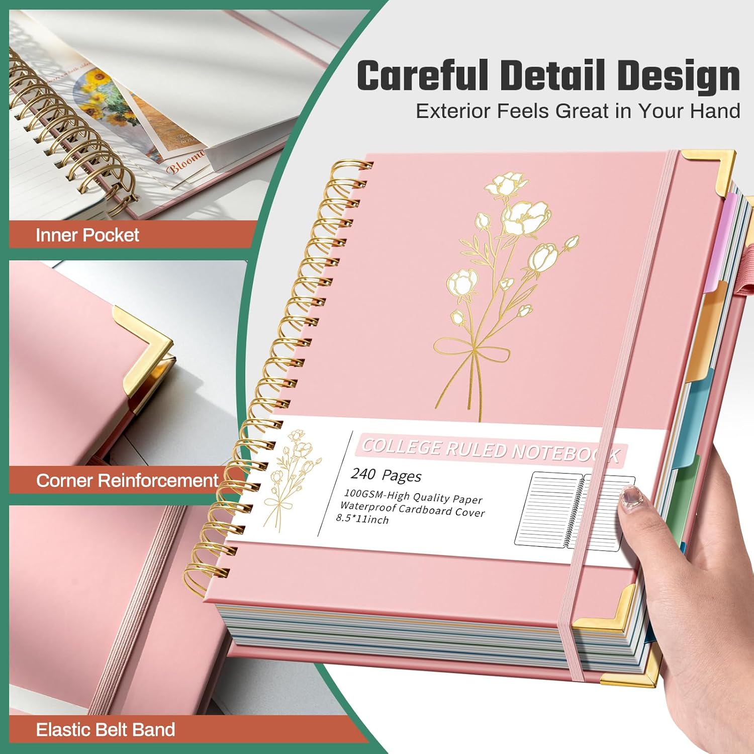- POCKET & PROTECTIVE CORNERS: The spiral notebook 8.5"x11" has an inner pocket for essentials (extra notes, cards, etc.). Its golden horn guards secure/protect the 5-subject college-ruled corners, boosting durability and delicacy.