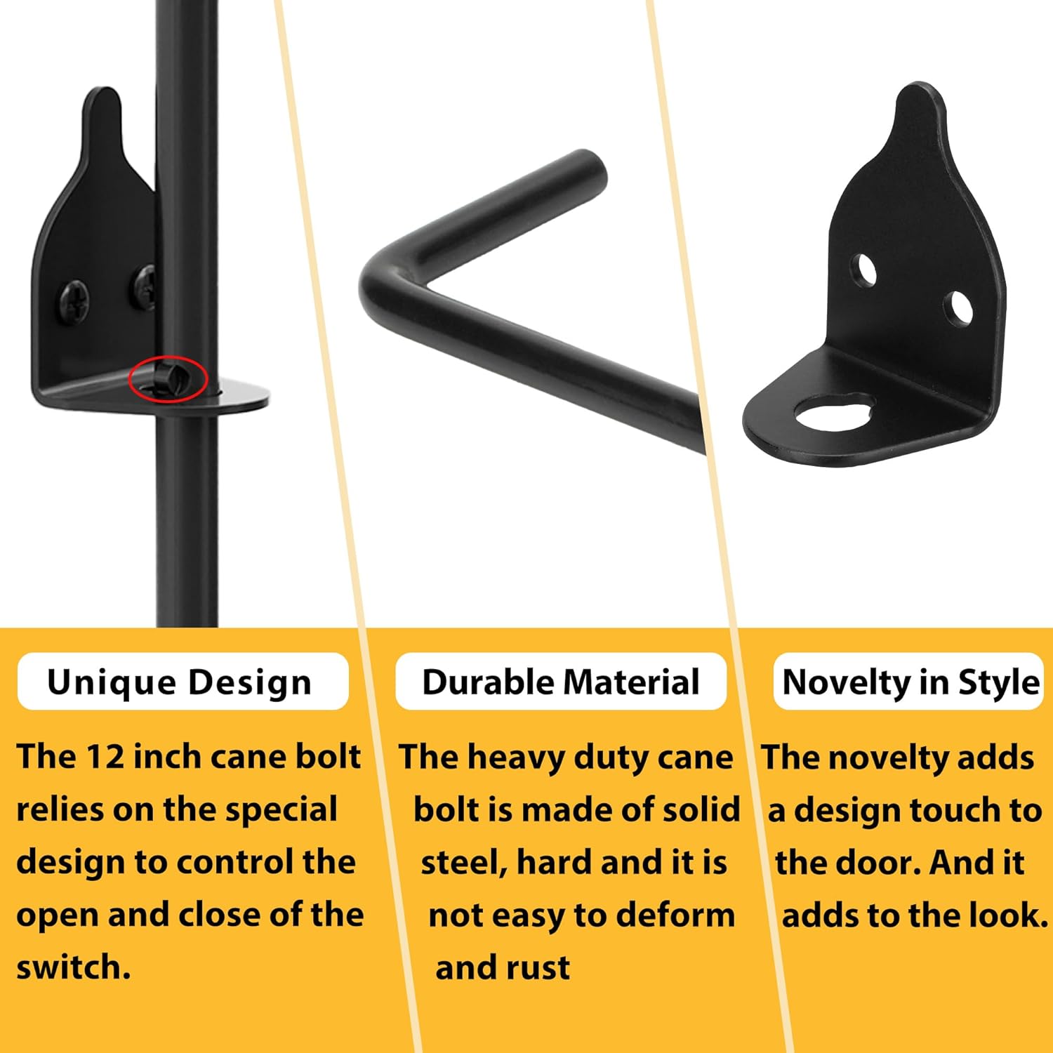 - đăMultiple Installă The 12 inch gate cane bolt is designed for use on heavy duty wooden gates, fences, and doors in vertical or horizontal applications. With the upper ear on the rod, match the two grooves on the bracket to prevent the cane bolt from slipping out when installed horizontally.