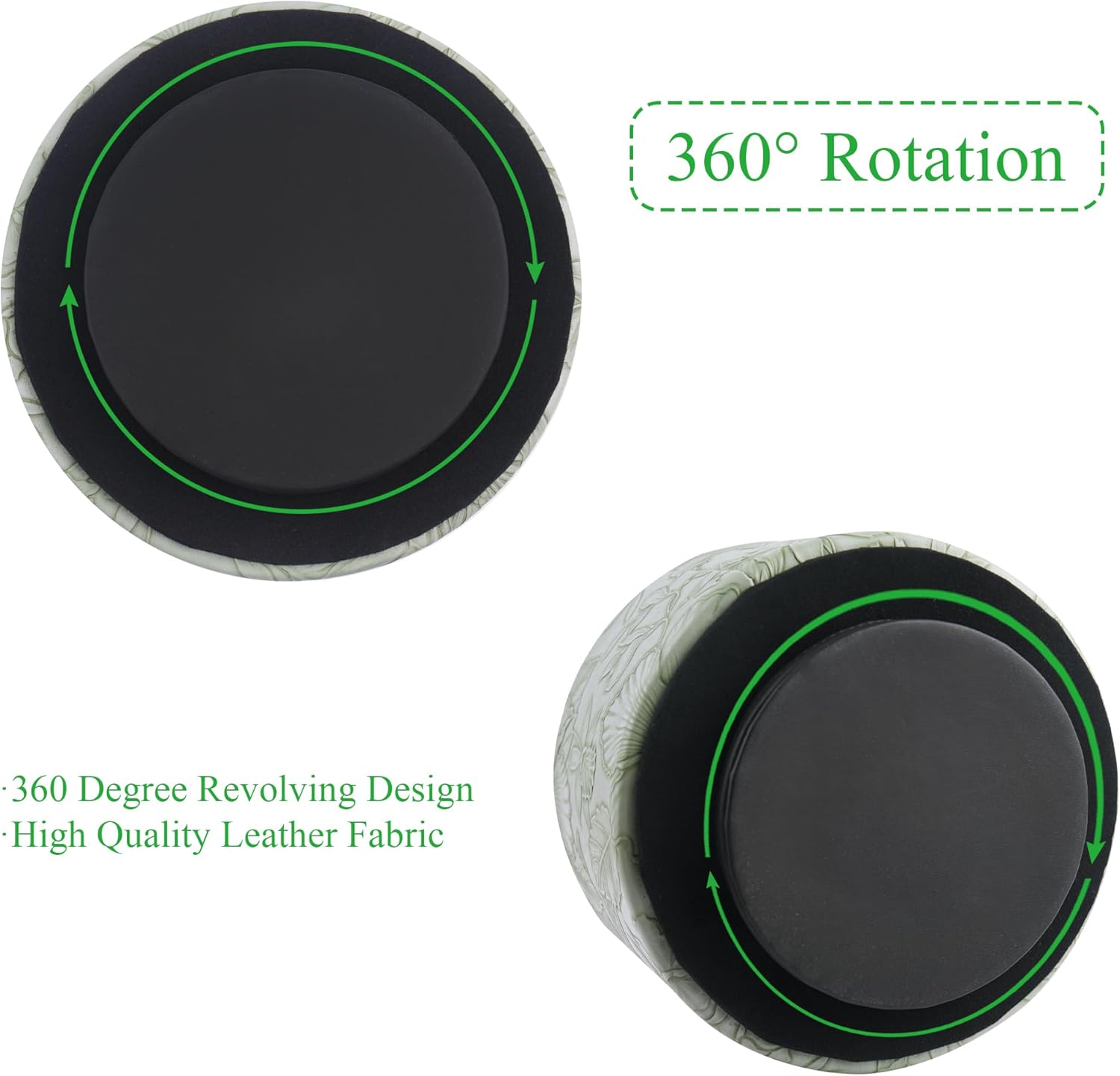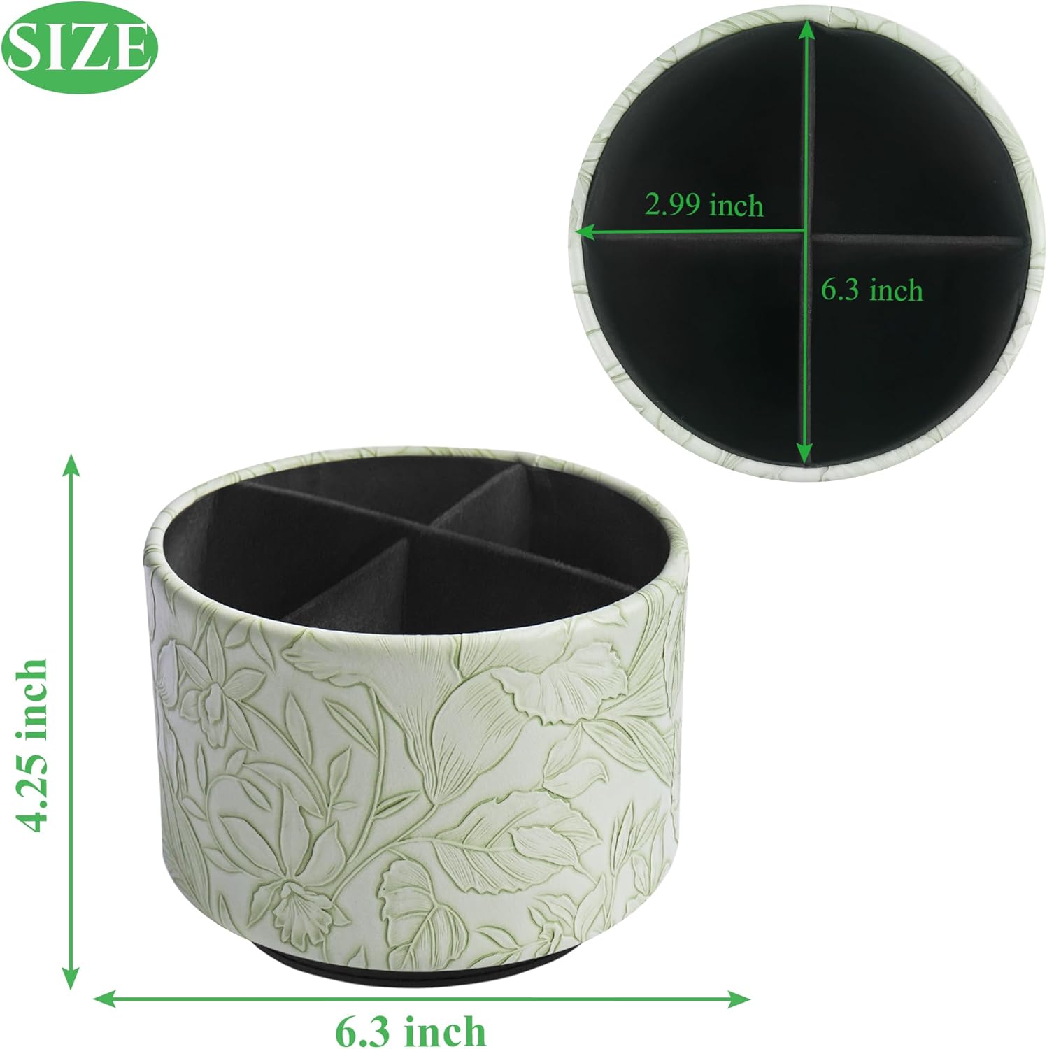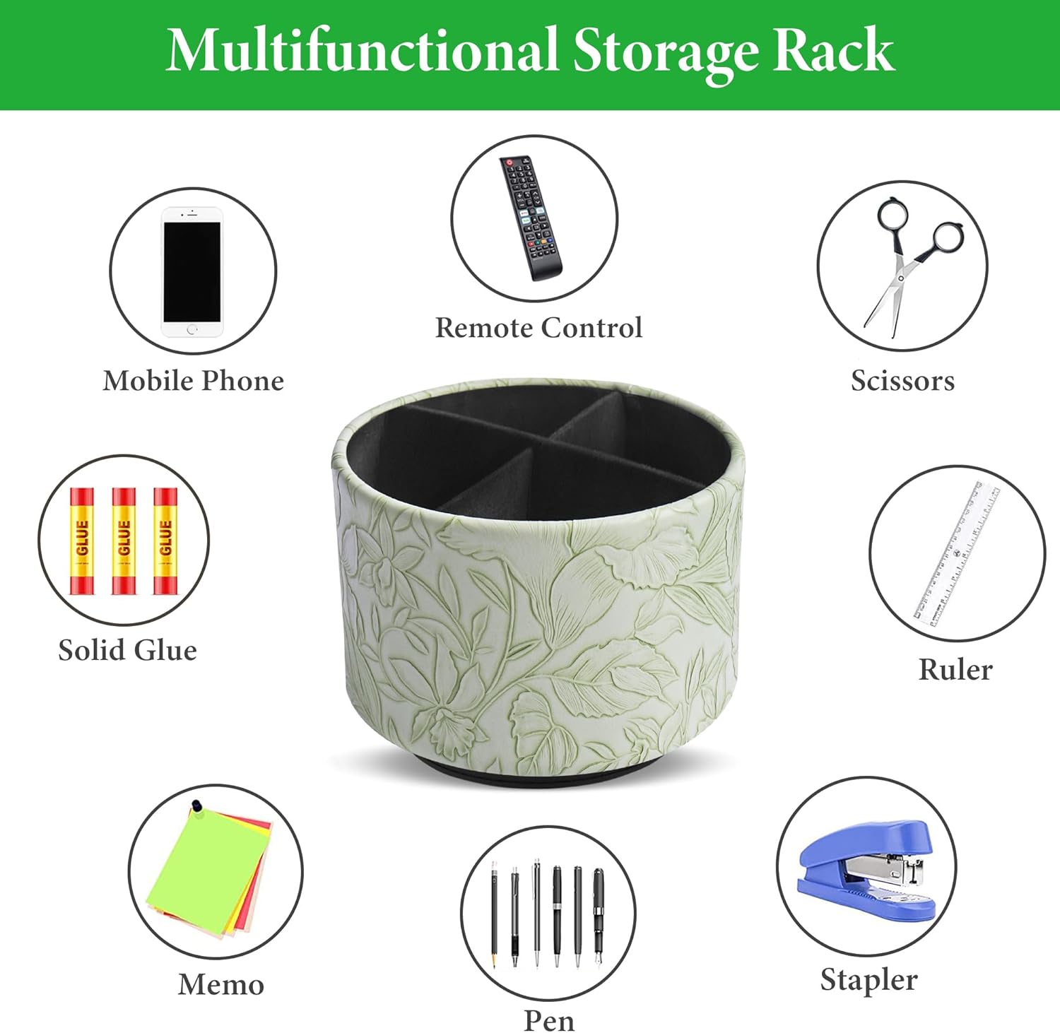 Hennaja Round Leather Art Supply Organizer,Remote Control Holder,360 Degree Spinning,Multi-Functional Pencil Holder,4 Compartments Desktop Stationary Organizer(1-Carved Green)