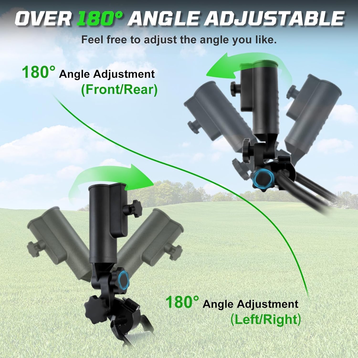 - 360 Degrees Adjustment: The golf push cart umbrella holder adopt the double knobs design, free to adjust the umbrella holder to left or right, forward or backward. The central rotating made of ABS plastic, and more durable. Umbrella stand extension also has two clamps for double holding the umbrella strongly
