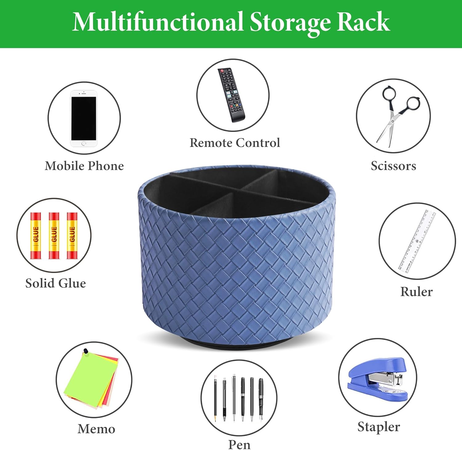 Hennaja Round Leather Art Supply Organizer,Remote Control Holder,360 Degree Spinning,Multi-Functional Pencil Holder,4 Compartments Desktop Stationary Organizer(1-Weave Blue)