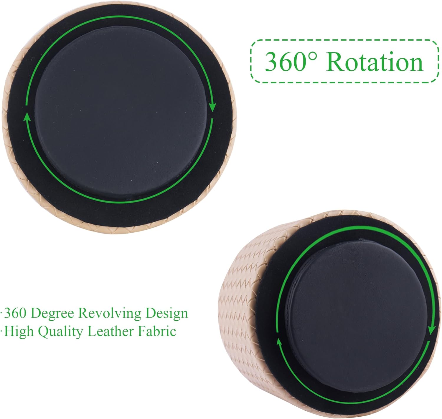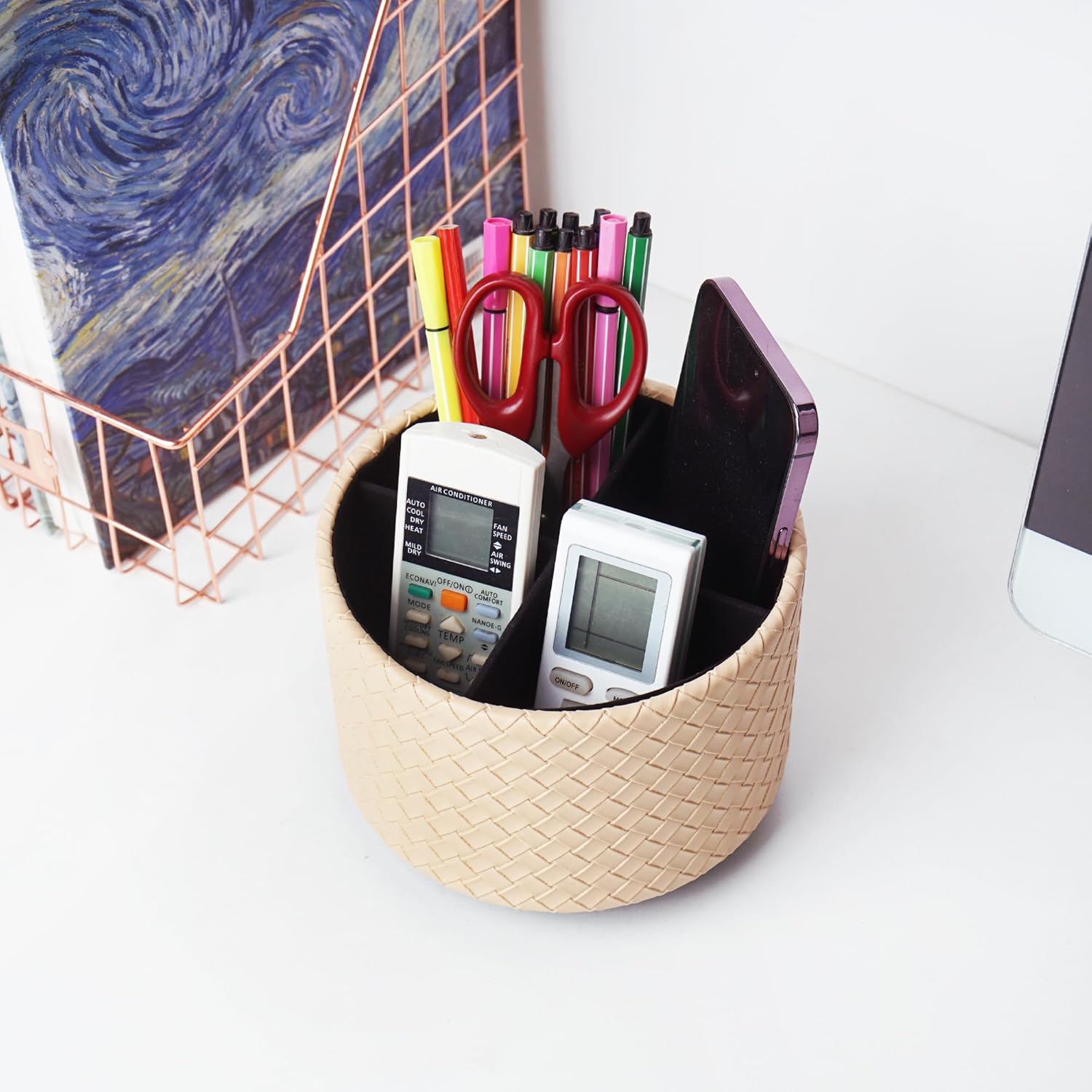 Hennaja Round Leather Art Supply Organizer,Remote Control Holder,360 Degree Spinning,Multi-Functional Pencil Holder,4 Compartments Desktop Stationary Organizer(1-Weave Khaki)