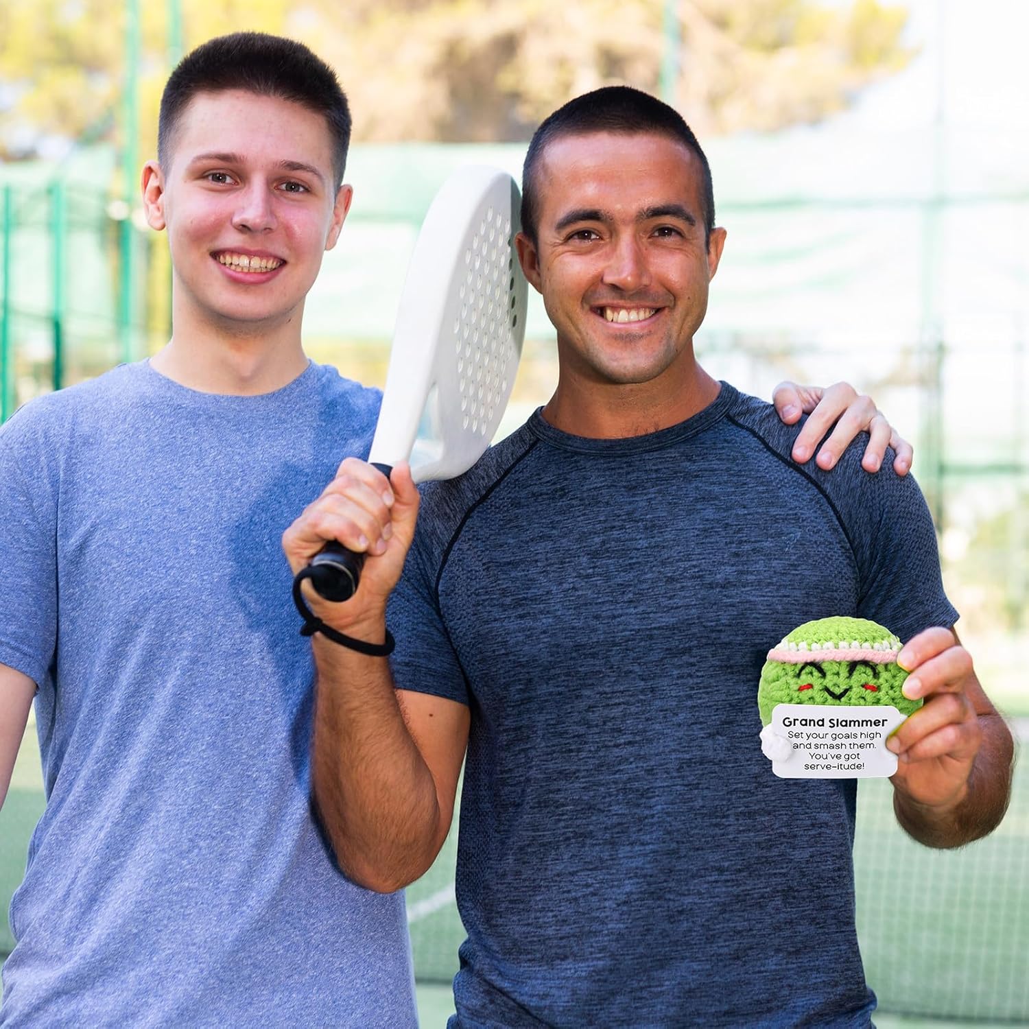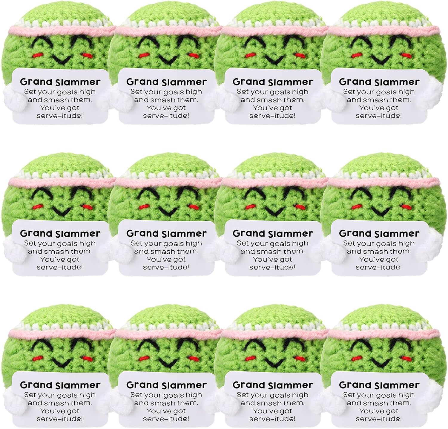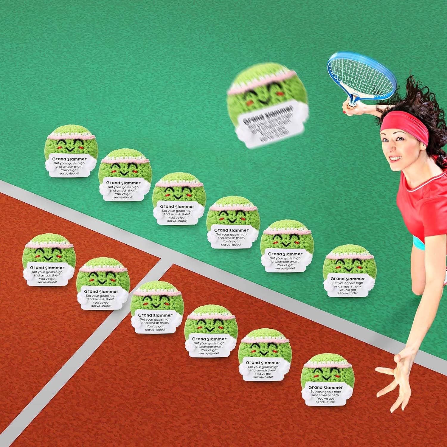 12pcs Funny Tennis Gifts for Team Bulk Tennis Balls with Motivational Cards Positive Handmade Mini Crochet Team Gift for Coach Women Men Coworker Birthday Christmas Party Favors