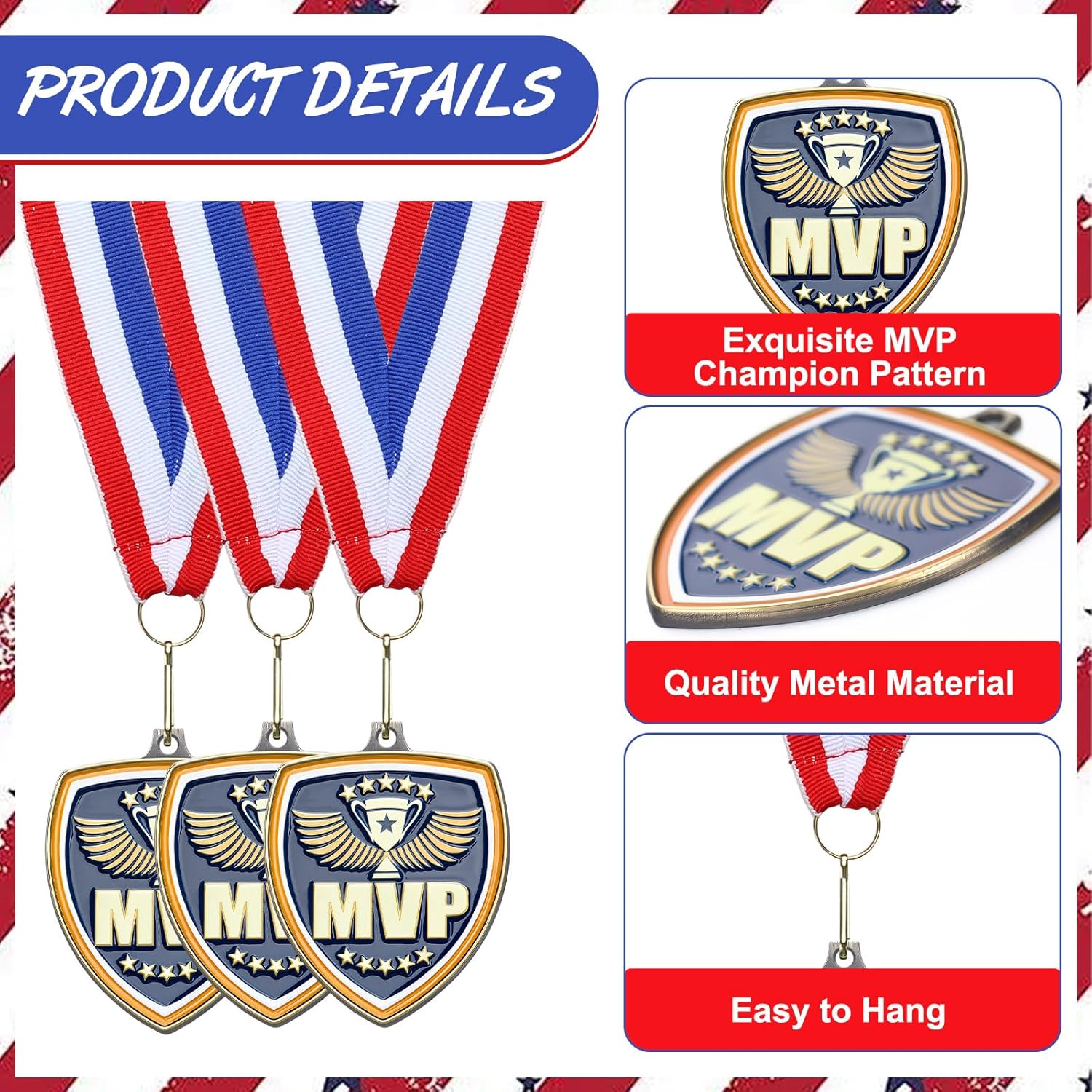 - Adequate Number Bulk: our sufficient package has 20 pcs MVP awards medals with mixed red, white and blue neck straps, these shield shape medals are suitable for you to honor multiple individuals and teams. These gold MVP champion medals bulk are ideal to serve as party favors