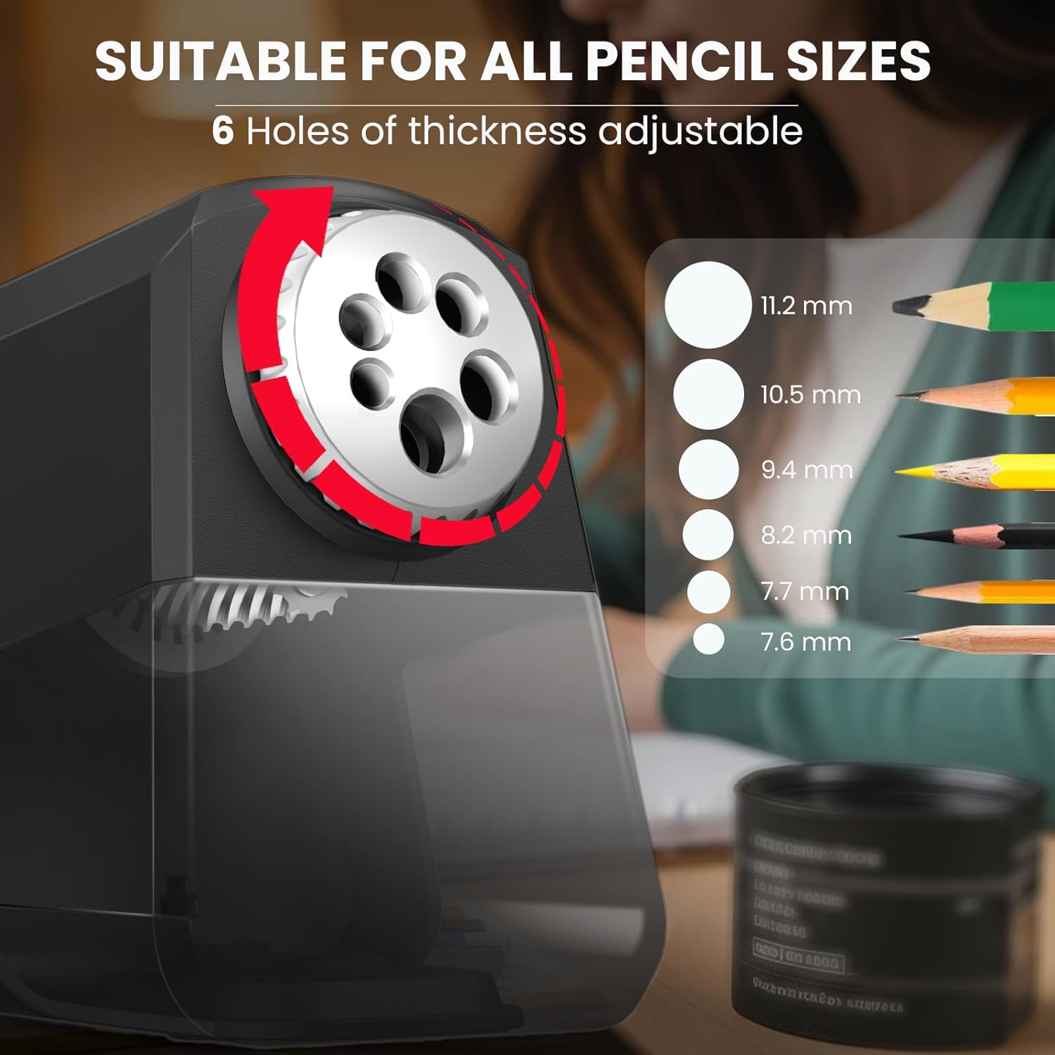 - Wide Compatibility: Compatible with 6–11mm graphite, colored, and charcoal pencils – this heavy duty electric pencil sharpener suits classroom, office, and studio needs