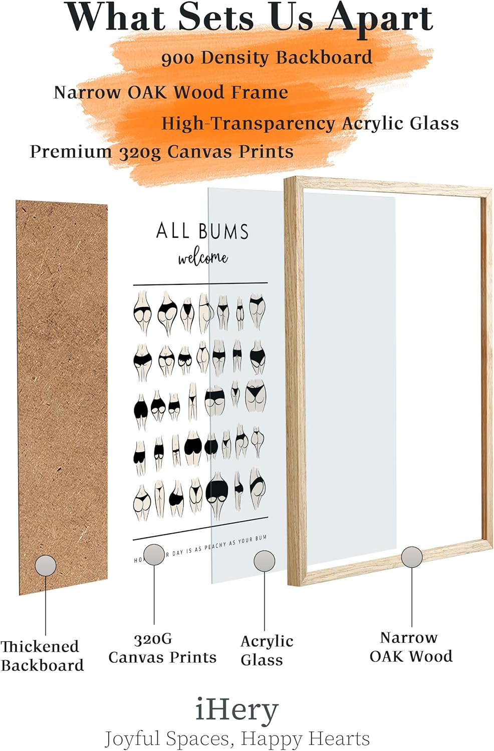 - 12x16in Humorous Bathroom Canvas Art: Featuring the cheeky quote "All Bums Are Welcome" with a fun "Nice Butt" twist, this canvas print adds personality and humor to any restroom space.