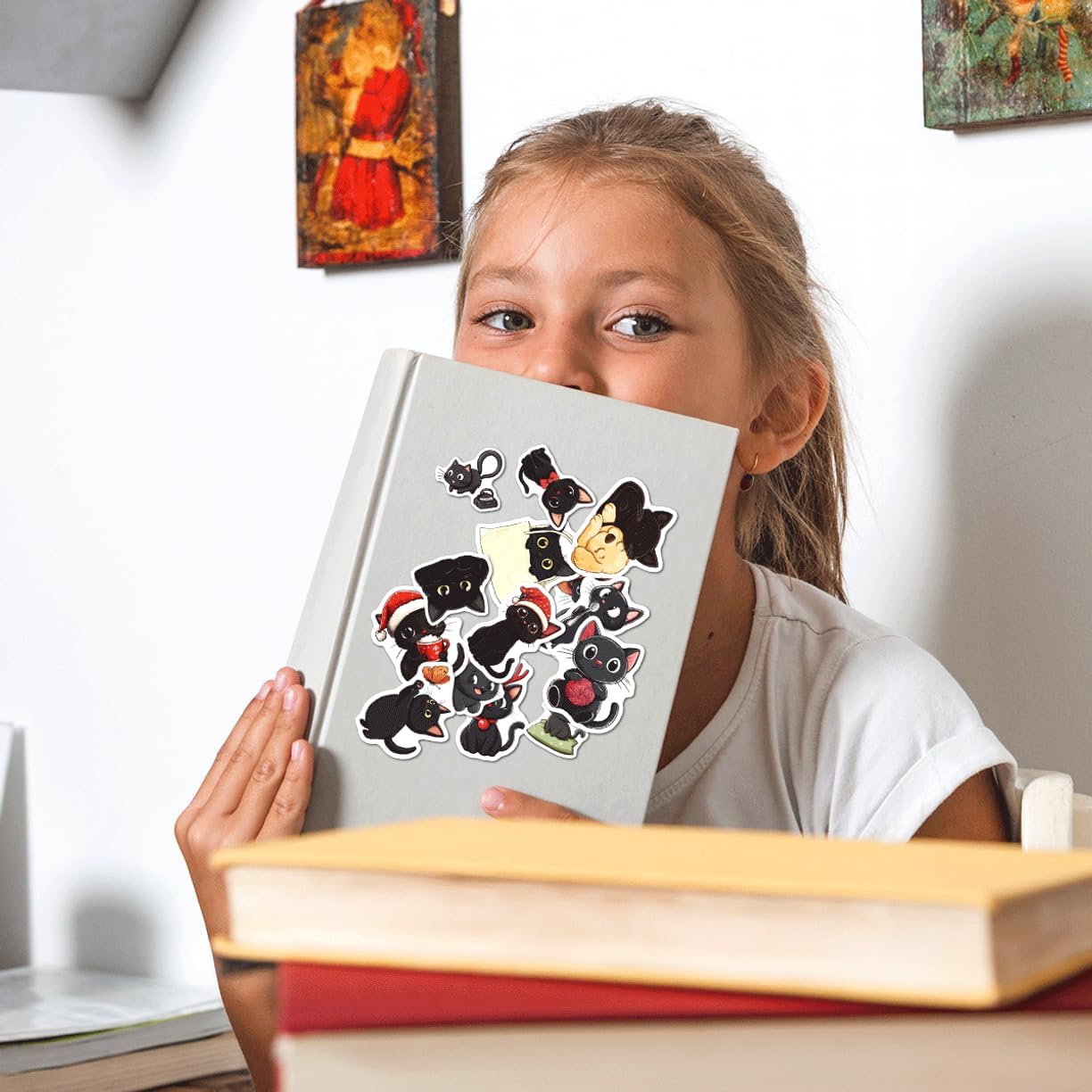 - Cute Black Cat Variety: This pack includes 108 unique vinyl stickers featuring charming black cats in cozy cartoon scenes like cuddling, reading, or playing. anyone who loves adorable cat-themed designs