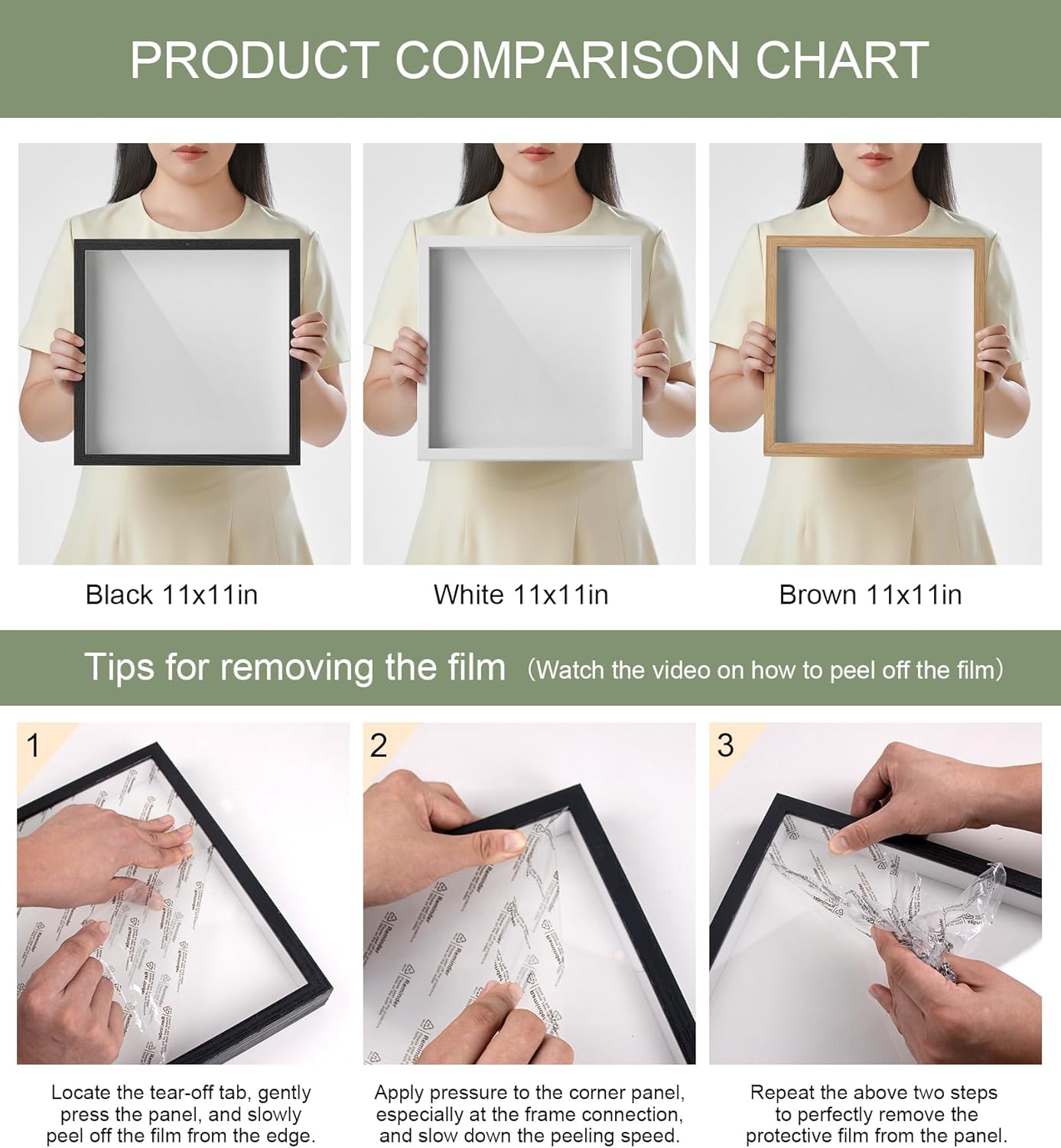 - 【Shock-Resistant Foam Packaging】We understand the importance of a perfect unboxing experience! We've upgraded your shadows box frames packaging: reinforced crush-resistant cardboard box (shockproof) + full plastic seal (dustproof) + reinforced corner protectors (impact-resistant) + dual-sided protective film on the front panel (scratch-proof). We meticulously craft our packaging to ensure you receive your shadowbox picture frame flawless and undamaged,ready to preserve every precious moment of your life. Film Removal Tip: Gently peel from a corner,pressing along the edge to avoid leaving marks and maintain its pristine appearance.