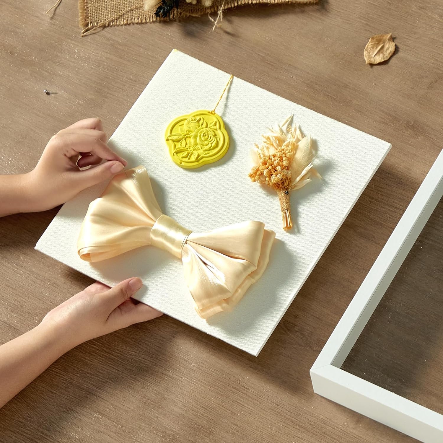 - 【RTZQQIN Shadow Box】This elegant 11x11in shadow box frame features a 0.25in thick white linen backing and 6 push pins,instantly elevating your dried flowers、medals、pets、graduation mementos,and other cherished items into art displays,Effortlessly create your own memory space.
