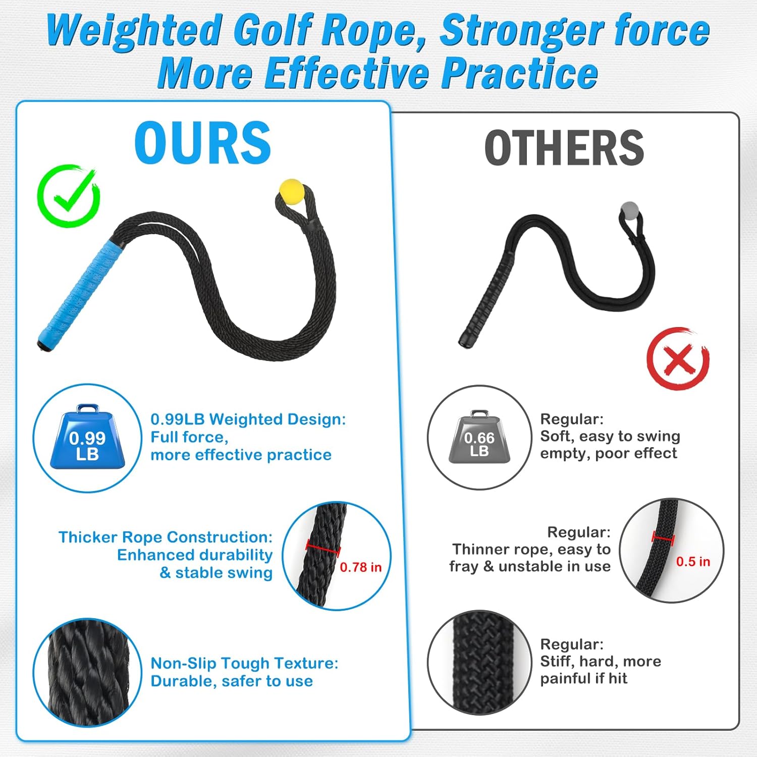 - 【Swing Training Benefits】: Golf swing rope trainer helps to exert force correctly, adjust rhythm and speed. Helps improve the tempo of the swing. Suitable for warm-up and reducing the risk of injury during exercise. Dense-weave material rope golf swing trainer weight is 0.99LB, more substantial than competing products, suitable for golfers of all levels.