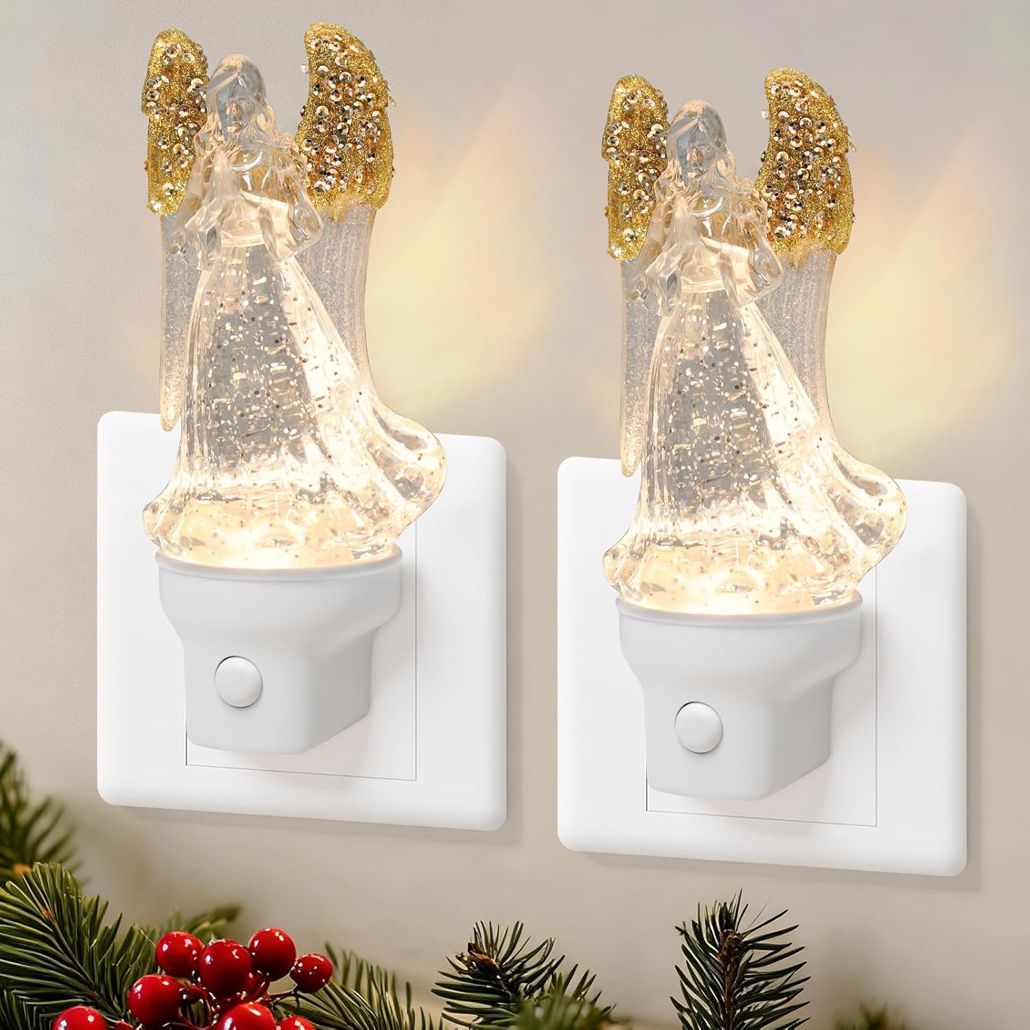 2 Pack Christmas Angel Night Light Plug into Wall Glitter Water Nightlight with USB/Outlet Options, Christmas Decorative Nightlight for Bedroom Kitchen Nursery Holiday Decorations Gifts (Angel)