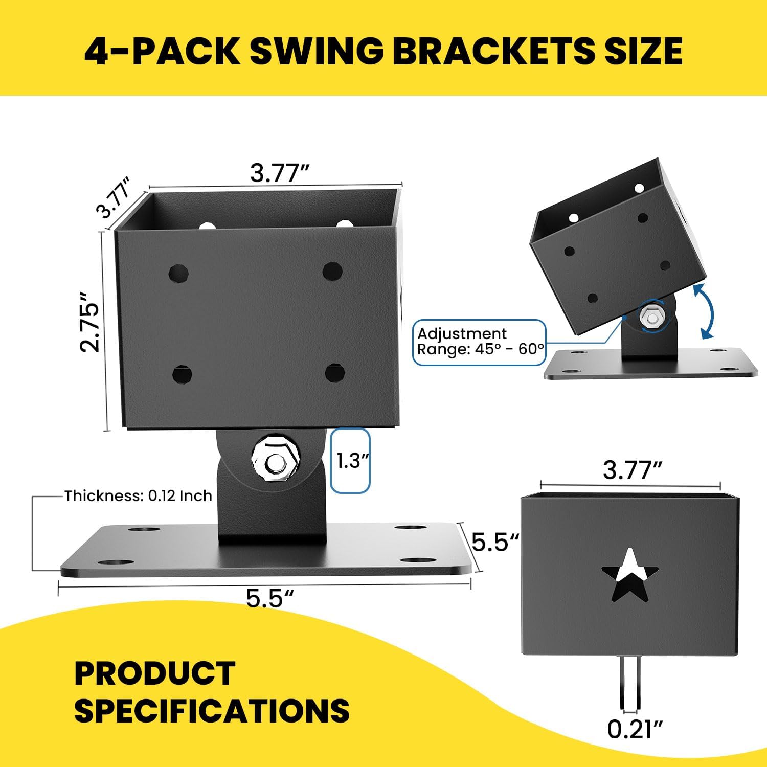 - [Universal Fit for Any Swing Set] Fits standard 4"x4" (actual 3.5"x3.5") wooden legs with adjustable pivot (45°-60° spread, 75° inward tilt). Installs on grass, concrete, or dirt without scratching surfaces. No welding needed—compatible with most DIY swing kits!
