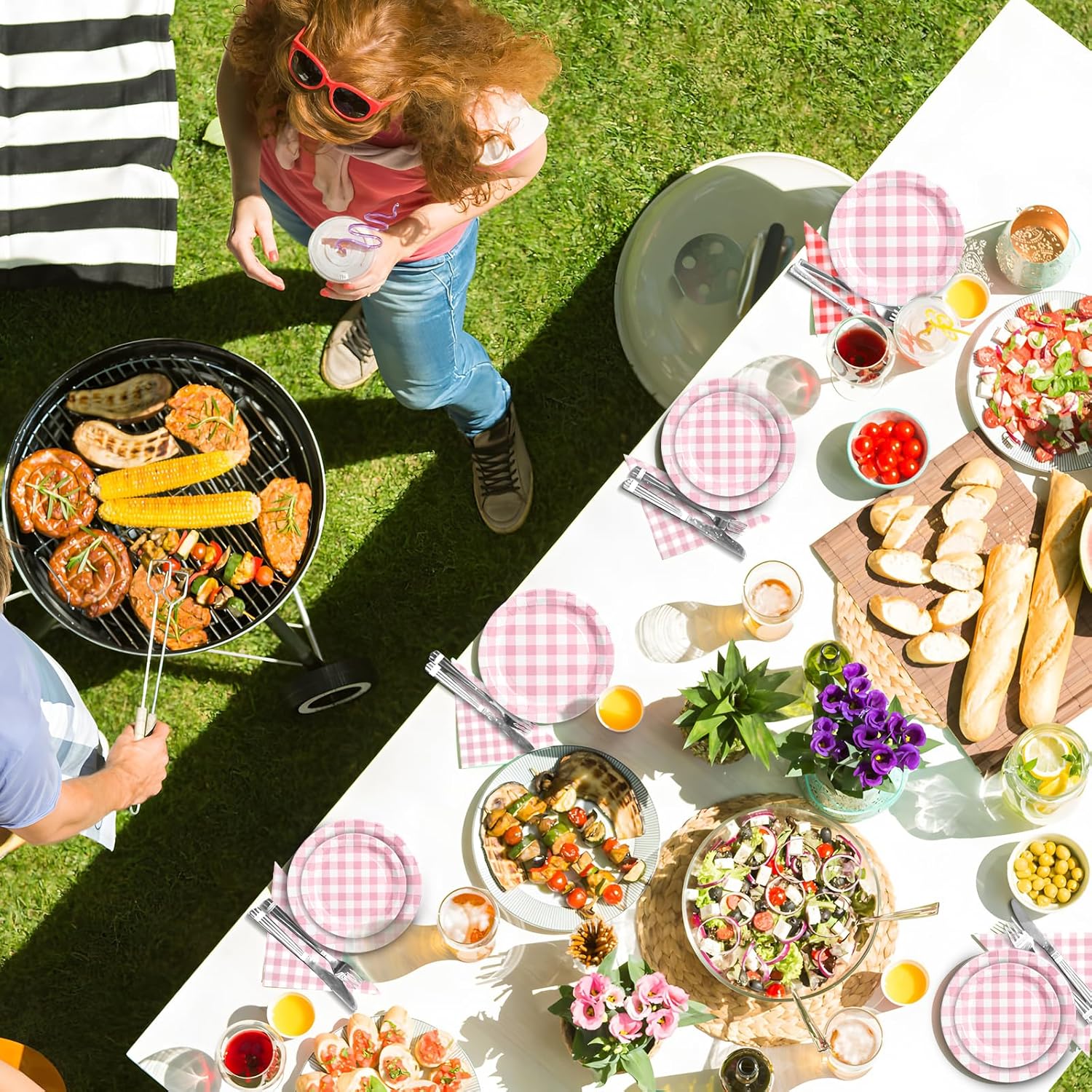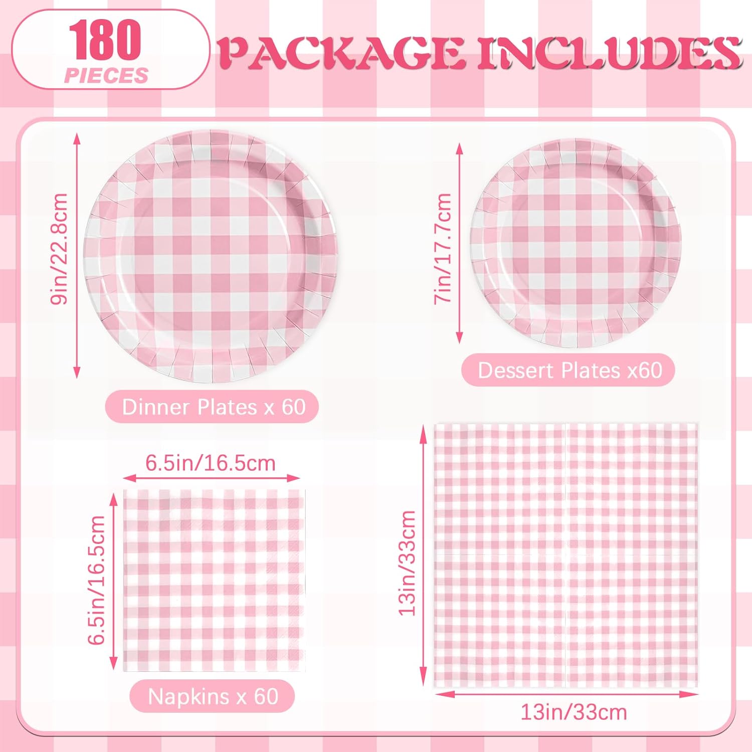 180Pcs Pink Gingham Party Supplies Paper Plates and Napkins Serve 60 Disposable Tableware Set for Birthday Party Decorations Game Day Family School Holiday Sports Events