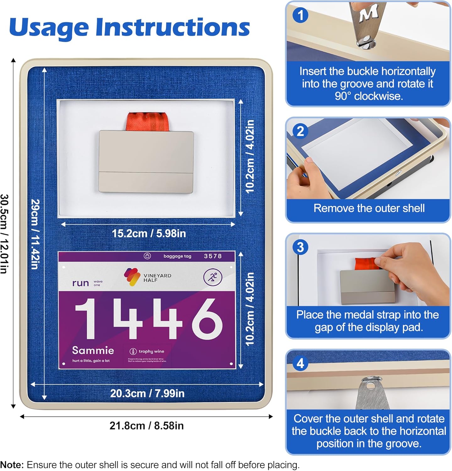 - DISPLAY CAPACITY: A3 holds 1 medal, 1 photo, and a race bib; A4 holds 1 medal and 1 photo; A5 holds 1 medal