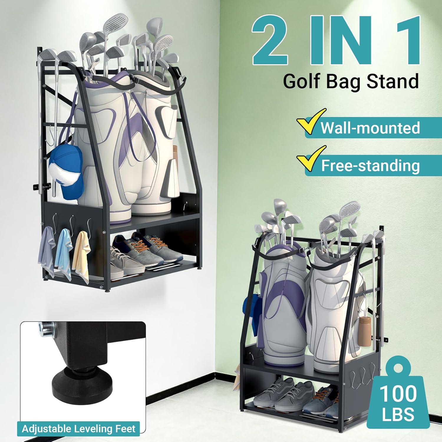 2-in-1 Wall Mount Golf Bag Organizer - Holds 2 Golf Bags w/ 4 Club Racks, 10 Hooks & Storage Shelf - Free-Standing Golf Bag Stand w/Adjustable Feet for Garage, Store, Club, Shed