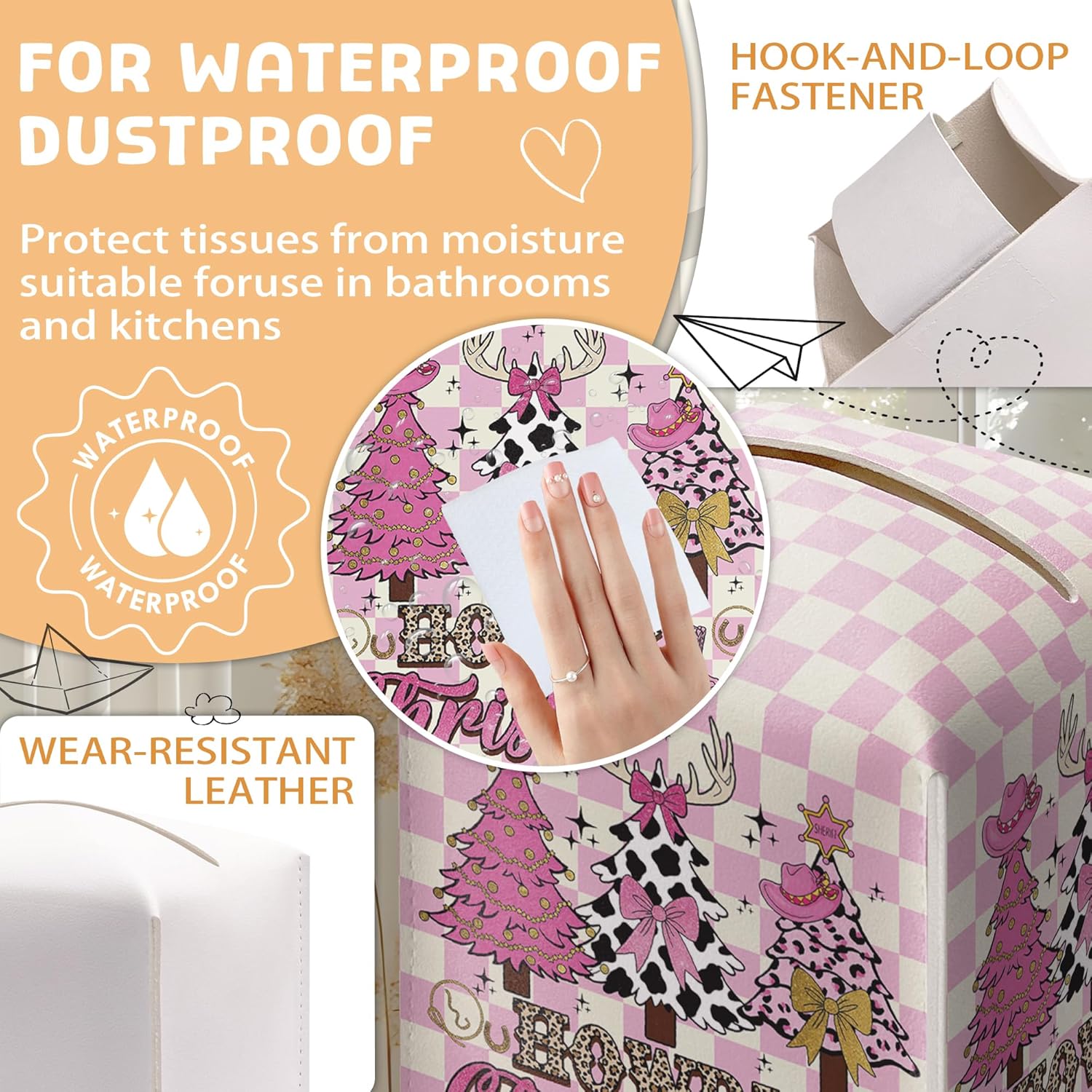Howdy Christmas Tissue Box Holder, Pink Checkered Cowgirl Western Christmas Trees Leather Tissue Box Cover Square, Paper Facial Decorative Tissues Cover for Bathroom Office Home Decor-B07