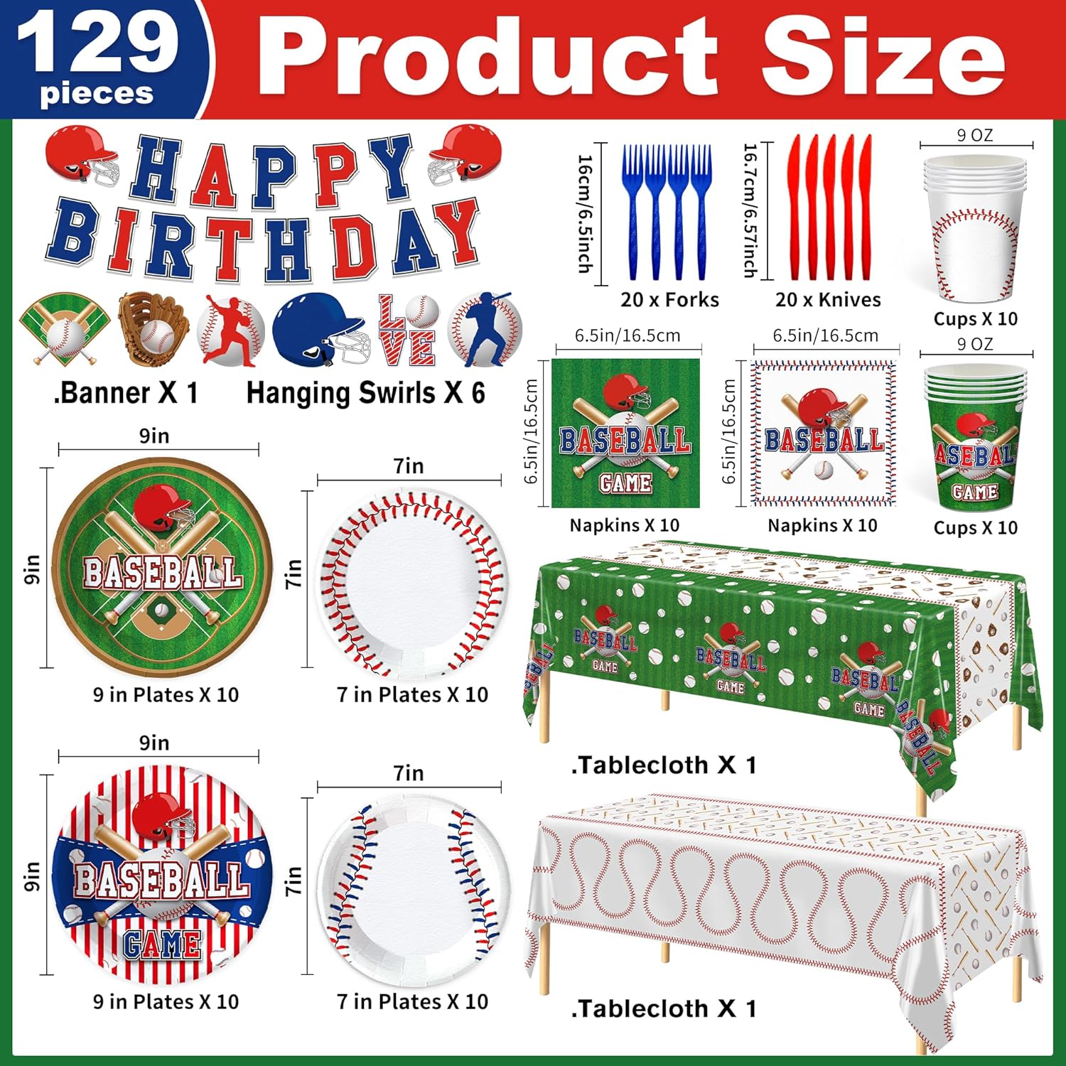 - Included Components : 【Baseball Party Supplies】: This Set Includes 20Pcs 9-Inch Plates, 20Pcs 7-Inch Plates, 20Pcs 6.5-Inch Napkins, 20Pcs Forks, 20Pcs Knives, 20Pcs Cups, 2Pcs Baseball Tablecloths (54 X 108 Inches),6Pcs Hanging Swirls With A Cool Happy Birthday Banner. Throw An Unforgettable Baseball Themed Birthday Party! 【Baseball Party Supplies】: This Set Includes 20Pcs 9-Inch Plates, 20Pcs 7-Inch Plates, 20Pcs 6.5-Inch Napkins, 20Pcs Forks, 20Pcs Knives, 20… See more