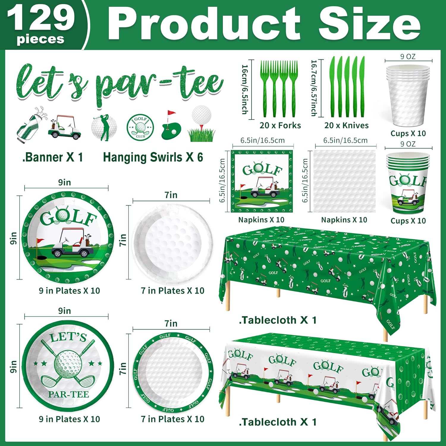 129Pcs Golf Party Supplies -Serves 20 Party Decorations With Plates Cups Knifves Forks And Napkins Tablecloth And Banner For Birthday Party Decorations Game Day Family School Holiday Sports Events
